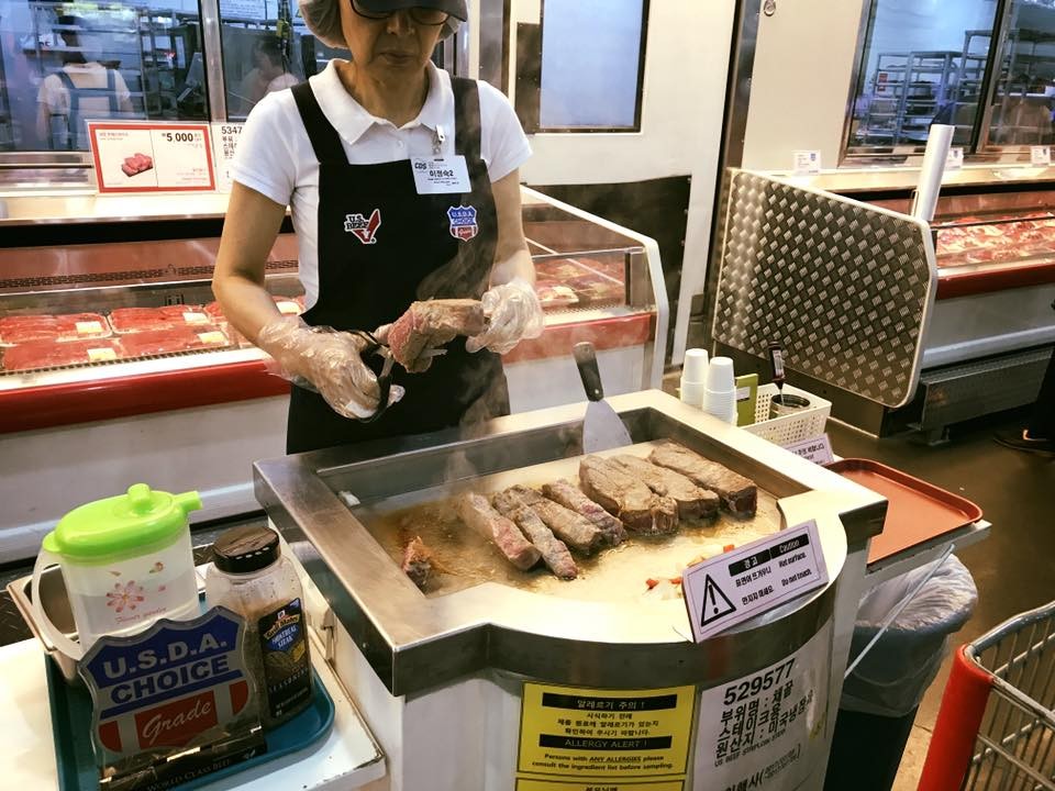 黃姓女網友7日在「Costco好市多 商品經驗老實說」社團貼文,分享一張於南韓好市多拍下的照片,只見一位阿姨正將牛肉剪開,放上煎台烹煮,一旁還標示著牛肉的等級,在U.S.D.A.(美國農業部)8個等級中排第二的「Choice」,僅次於最高級的「Prime」。最震撼的是,鐵盤上的牛排份量超大,更勝於手掌大小,她直言,「韓國的好市多試吃讓我好驚艷」!