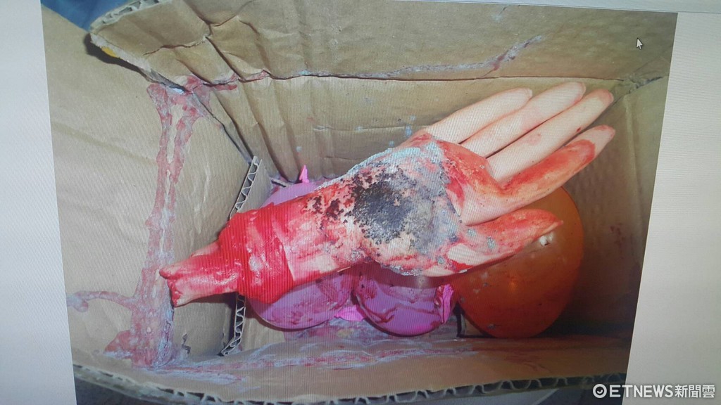 ▲包裹打開,竟然是一隻塗了紅漆,還有火燒痕跡的假手。(圖/記者楊佩琪翻攝)