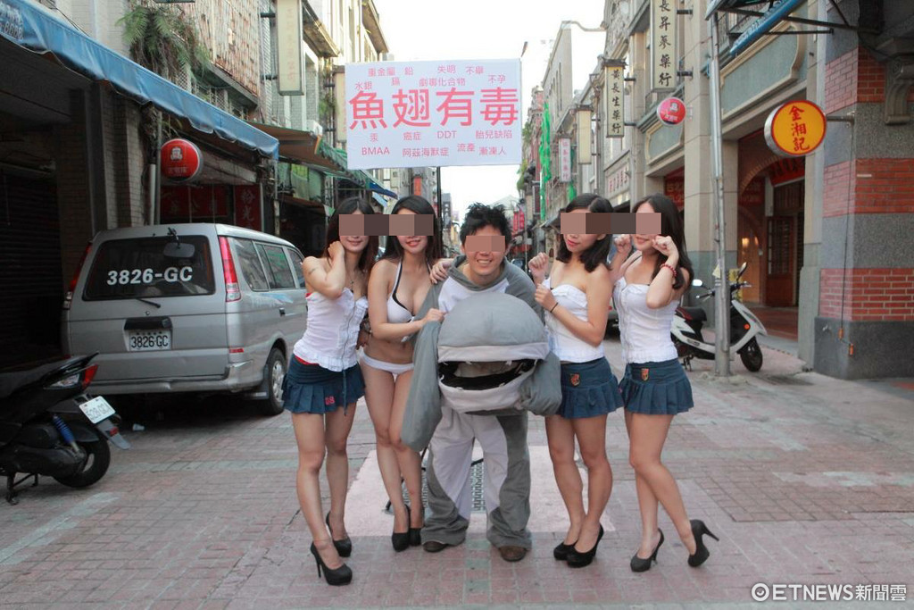 ▲施男曾扮成鯊魚到迪化街宣導「沒有買賣,沒有殺害」,一旁有清涼辣妹助陣。(圖/翻攝自護鯊哥粉絲專頁)
