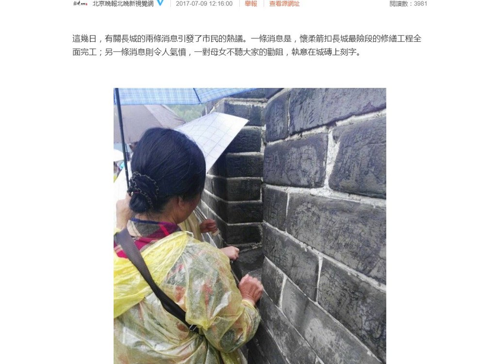 ▲身穿黃色雨衣的母女在長城牆上刻字 。(圖/翻攝北京晚報微博)