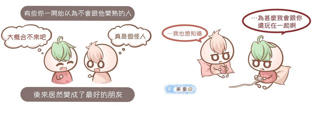 從左邊圖文的兩人,在一開始見面的時候,內心都覺得對方很奇怪,分別想著「大概合不來吧..」、「真是怪人」,心裡都默默認定「大概無法成為朋友吧」;接著看到圖文右方的兩人,認識一段時間後,卻都賴在對方身邊,玩在一起,甚至還好奇又無奈的問著,「為甚麼我會跟你還玩在一起阿」,另一人則回「....我也想知道」。