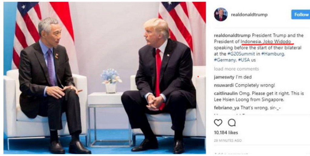 文字説明原文是這樣的:「川普總統與印尼總統佐科威攝于兩人開始雙邊會談之前。」 照片是在德國漢堡當地時間晚上11點上傳,不過在眾多網友留言提醒後,文字說明很快就被修改,變成了「川普總統與新加坡總理會晤」。
