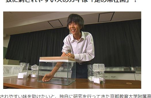 為何某些人特別易招惹蚊子?有幾種說法,像是體質偏酸或是體溫較高的人。日本16歲的田上大喜(たがみだいき)看見妹妹常被蚊子叮咬,身為「妹控」的他開始研究,一開始以為是腳臭的關係,後來才發現妹妹腳上的細菌太多,一共有1279種,只要出門時先清潔一下腳板,被咬的機會大減至三分之一。