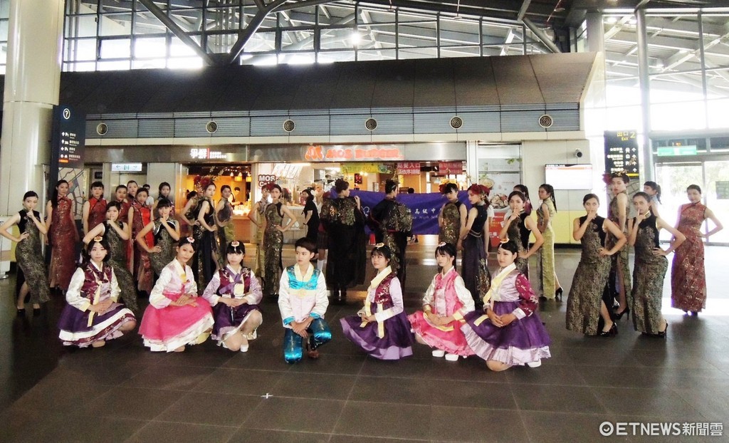 ▲台南市光華高中流行服飾科在校生和畢業生共20餘人,快閃高鐵台南站,以「文化服飾工藝之美」秀出兼具刺繡工藝和流行元素的旗袍。(圖/高鐵提供)