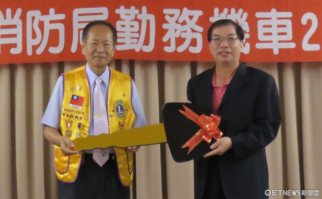 ▲林炳榮先生(左)捐贈勤務機車2輛,由台南市消防局長李明峯代表接受。(圖/消防局提供)