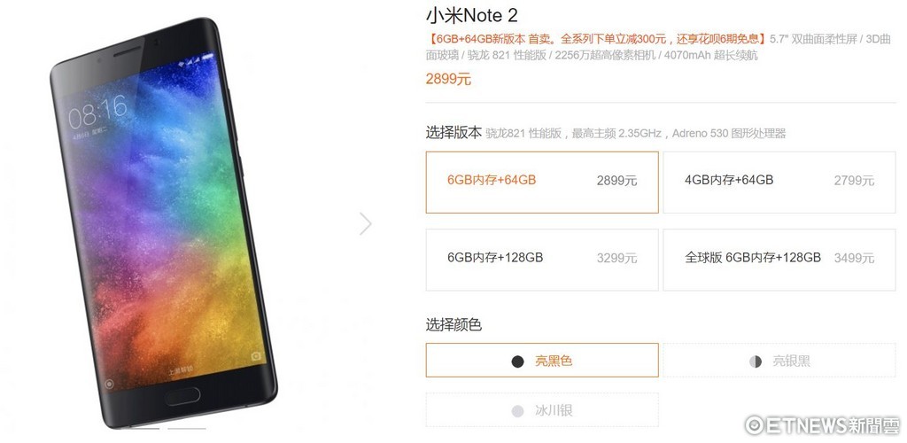 小米科技日前預告 7 月 11 日發表新機,結果跟多數媒體預測相同,確實是升規版本的小米Note 2,採用6GB RAM 和 64GB ROM,該版本同樣也是現有小米Note 2 在4GB/64GB、6GB/128GB之外,所唯一缺少的版本,其他硬體配置跟設計都跟小米Note 2 相同,不過僅推出亮黑版本,售價人民幣 2,899 人民幣元,折合新台幣約 13,000 元。