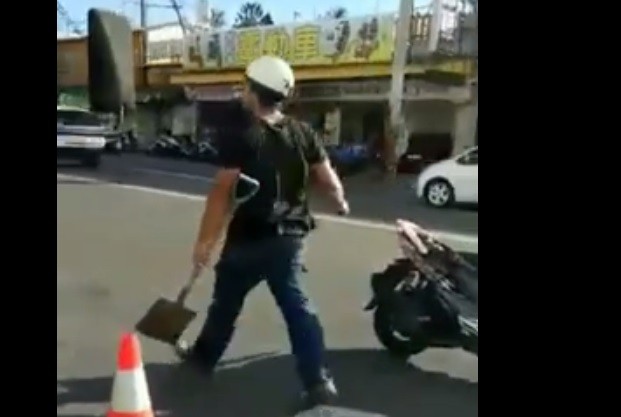高雄一名28歲的孔姓男子,11日下午5點多在楠梓區軍校路與右昌街口,和另一名28歲的楊姓男子發生行車糾紛,穿西裝的他機車倒在一旁,正要打電話報警,喝斥對方不要跑,沒想到楊男竟拿起車上的圓鍬和西瓜刀作勢攻擊,事後烙了一句,「沒給你死就算不錯了還走!」就騎走,畫面嚇壞許多人。