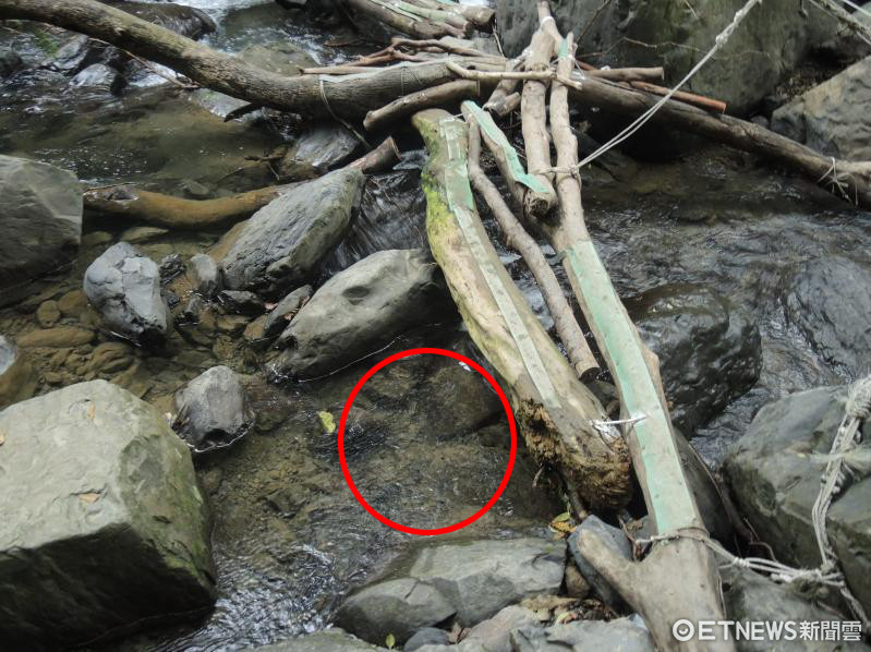 ▼樓姓老翁的腿骨在溪水中被發現(紅圈處)。(圖/記者柳名耕翻攝)
