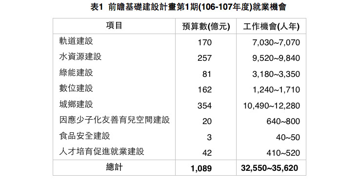 行政院11日公布前瞻基礎建設計畫106至107年度第一期特別預算共1089億元,根據國發會評估,預計第1期約可提供共3.3至3.6萬人年就業機會。其中城鄉建設354億元預估可帶來1萬0490至1萬2280個工作機會最多;食安預算3億元,創造40至50個工作機會最少。