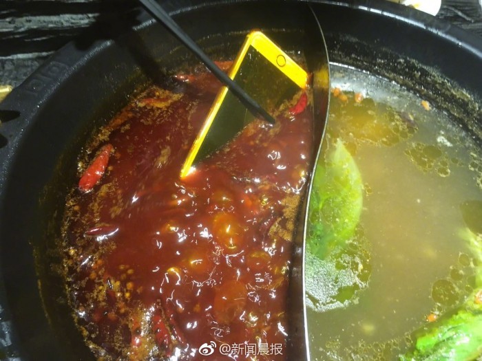 ▲汪女的手機整支掉進麻辣鍋中,被染成橘紅色。(圖/翻攝自微博《新聞晨報》,下同)