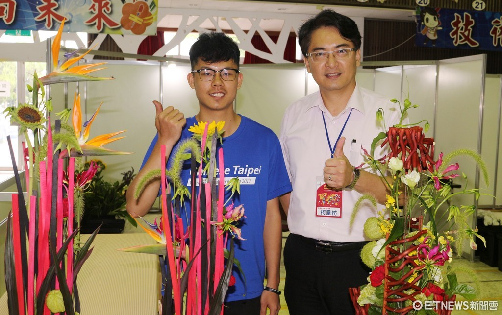 ▲東北亞技能邀請賽開打,雲嘉南分署長柯呈枋(右)到場,為花藝國手吳柏翰加油。(圖/雲嘉南分署提供)