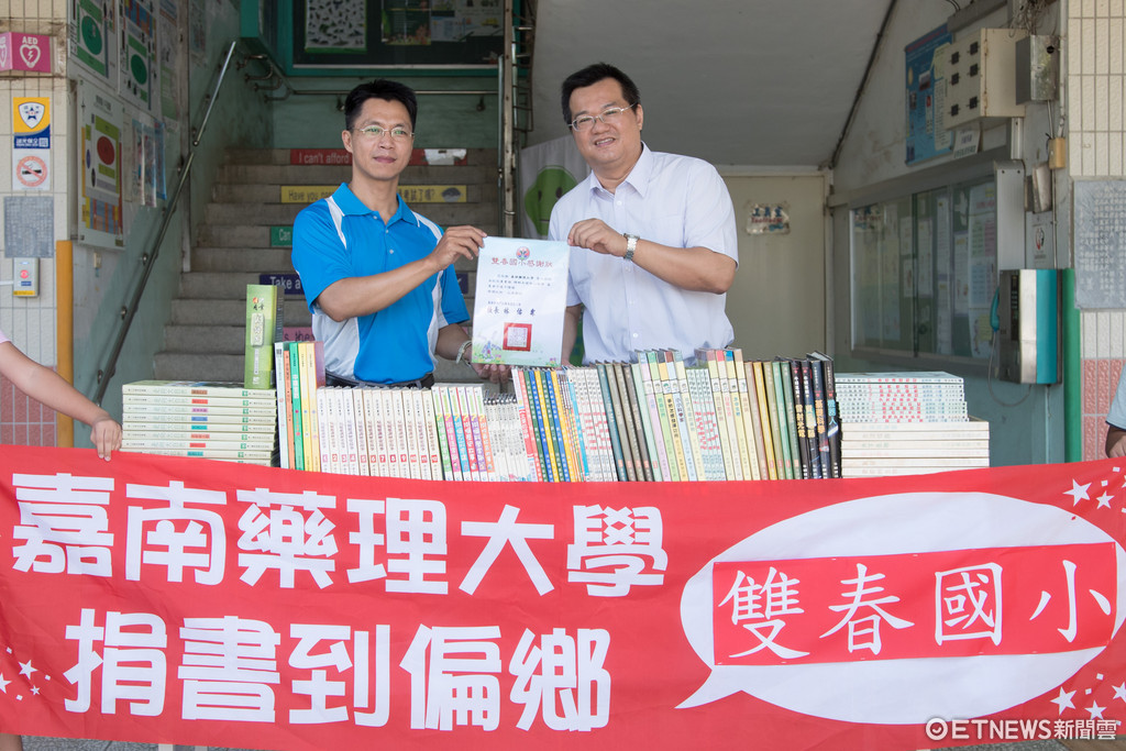 嘉南藥理大學號召全校師生及各界捐書,送愛到偏鄉!13日在該校圖書資訊館長薛雅明帶領下,將募得的好書以專車送至台南市北門區雙春國小,由校長林佑霖代表接受;透過簡單隆重的贈書儀式,將愛心及知識分享傳播給北門區的小朋友,嘉惠學童。