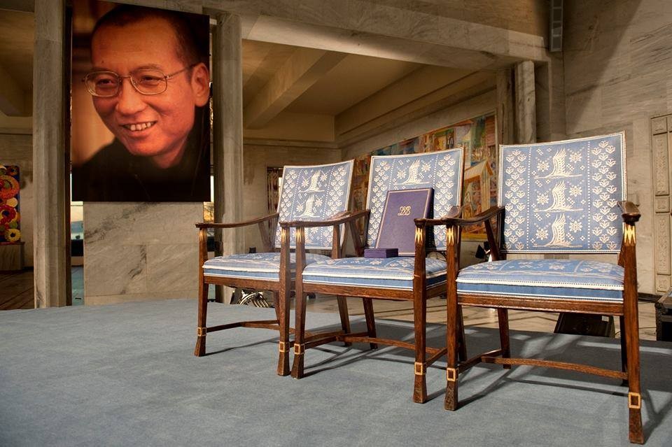 ▲為了紀念缺席諾貝爾和平獎得主的劉曉波,頒獎典禮期間放了一張空椅子。(圖/翻攝自諾貝爾獎基金會臉書)
