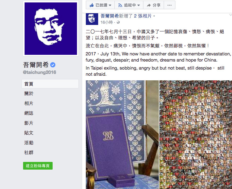吾爾開希則難過地在臉書表示,「二〇一七年七月十三日,中國又多了一個記憶哀傷、憤怒、痛恨、絕望;以及自由、理想、希望的日子。流亡在台北,痛哭中,憤恨而不氣餒,依然鄙視,依然無懼!」