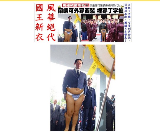 網友在Yahoo!奇摩拍賣網站虧了馬英九總統一下,用繪圖軟體把總統的西裝褲PS成蘭嶼當地的丁字褲。該位網友用「國王新衣」來諷刺馬英九,但是拍賣網頁在31日下午已經被管理員取消拍賣,原因是「這項商品因違反使用規範。」