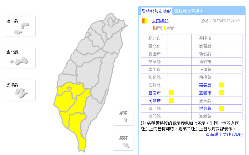 受到午後對流雲系發展旺盛影響,中央氣象局今(15)日下午2點10分,針對嘉義縣、嘉義市、台南市、高雄市、屏東縣發布大雨特報,提醒民眾注意注意雷擊、強陣風及溪水暴漲。