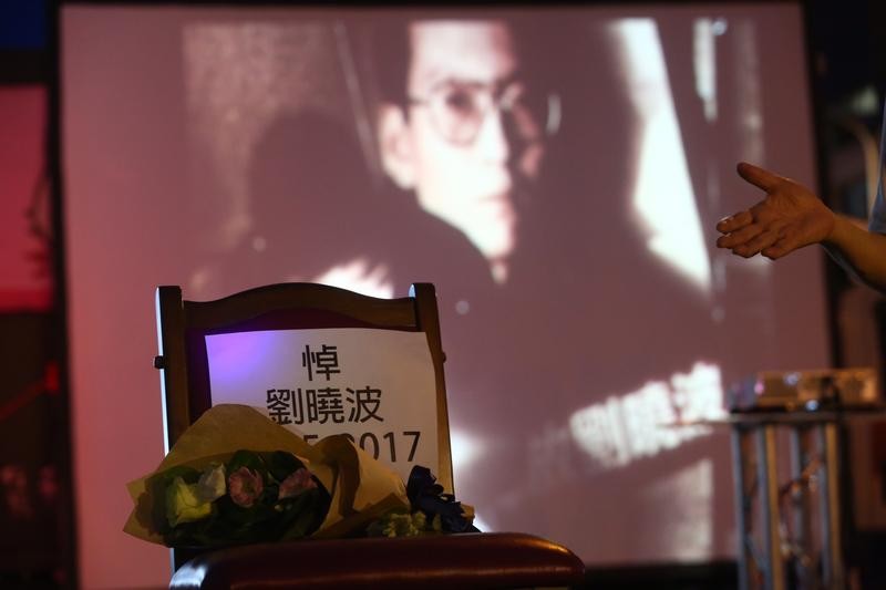 諾貝爾和平獎得主劉曉波病逝,14日晚間由人權團體發起的追思會,現場聚集近百名民眾,追悼劉曉波,更有民眾手持茉莉花放在無人的椅子旁,象徵劉曉波永遠無法親自領取的諾貝爾和平獎,人權團體更疾呼中國應該釋放劉曉波妻子劉霞。