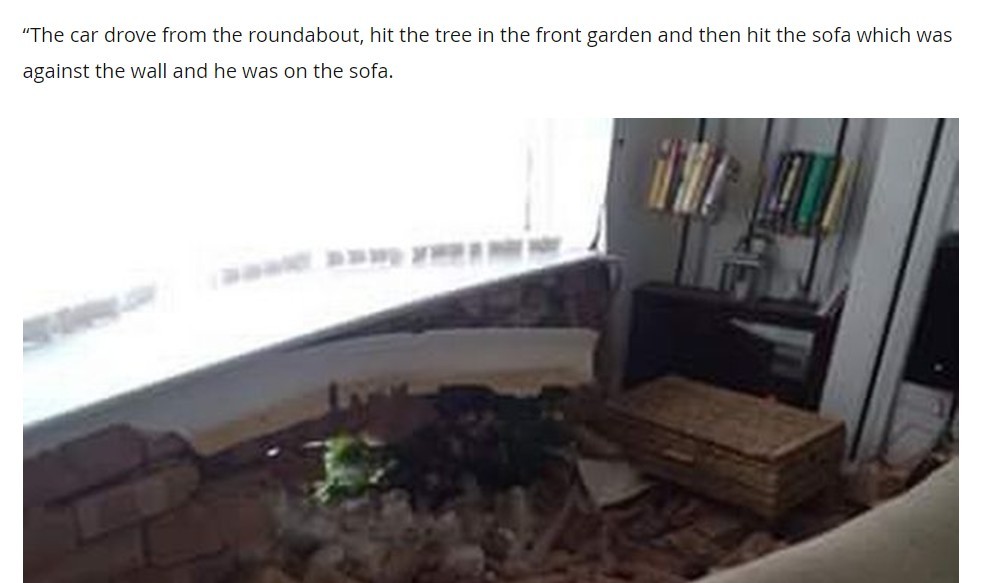 英國伯明罕26歲男賈利利(Amin Jalili)15日躺在家中沙發上,看電視看到一半突然有台車破牆而入,把他整個人撞飛導致背頸受傷,目前人仍在醫院接受治療。家人形容,當時覺得整個屋內立即塵土飛揚,感覺整棟房子都要倒塌下來。