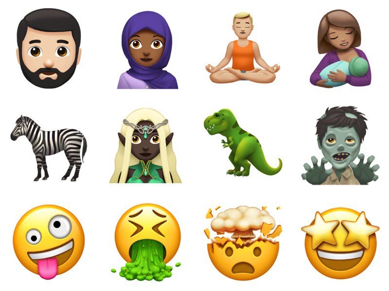 新的表情符號,包括專為穆斯林設計的戴頭巾女士,鬍鬚佬、餵養母乳的女性,以及三明治、椰子等食品。另外,還有更多的動物和神話中的生物,如暴龍,斑馬,殭屍和神燈精靈,讓使用者能以更有趣的方式來描述情況。