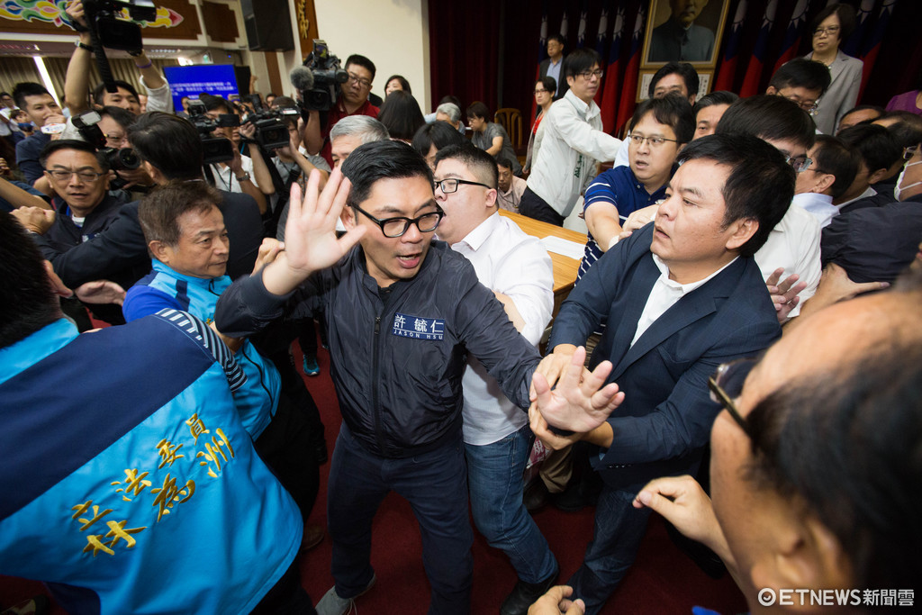 前戰大戰繼續開打!立法院財政委員會聯席會議18日審查前瞻計畫第1期預算,藍綠為會議主席一事爭執不休,潑水、翻桌樣樣來。混亂中,民進黨立委陳明文誤以為遭國民黨立委許毓仁攻擊,衝上前狠掐對方脖子;對此,許毓仁指控陳明仁「手勢力道之兇猛幾乎致你於死」,並感嘆這到底是什麼樣的國會?