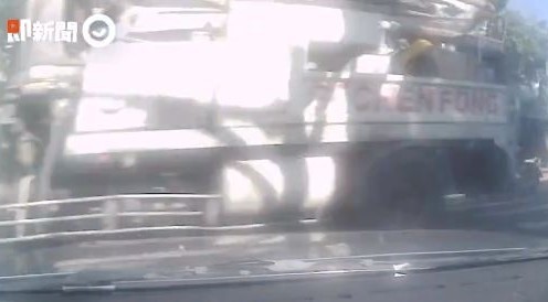 當時還有另一名停等紅燈的機車騎士,他才剛放下腳停妥,預拌混凝土車就直接呼嘯而過,嚇得馬上稍微向路邊偏移並縮起腳,幸運躲過一劫。