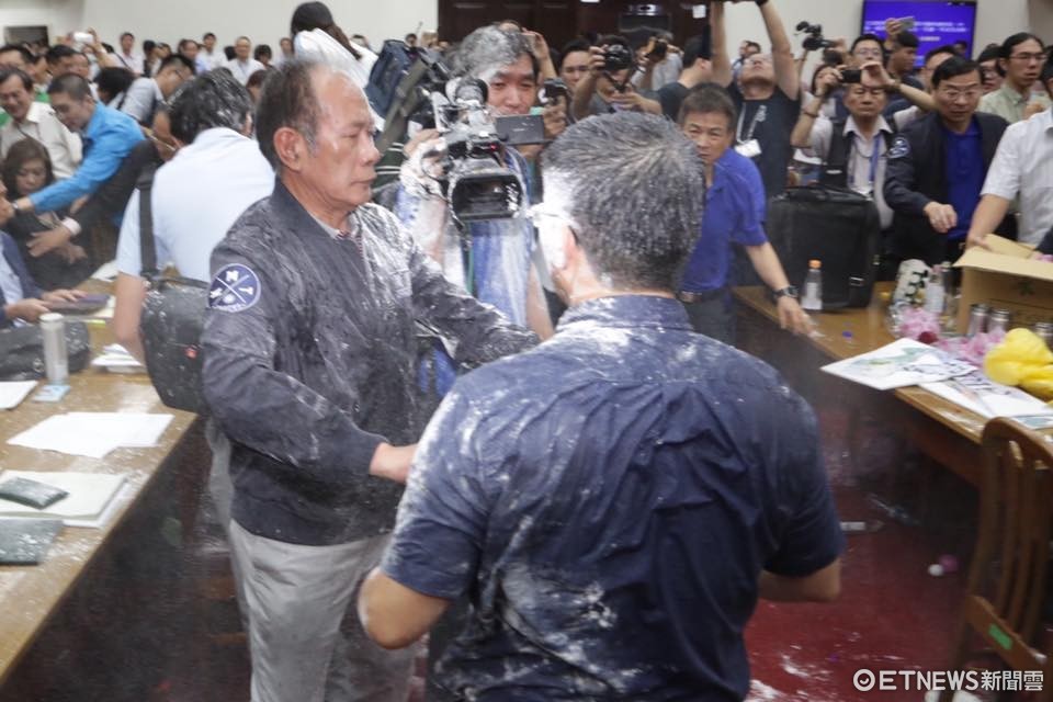 ▲為擋前瞻,國民黨團丟水球、撒麵粉、丟雞蛋。(圖/記者林世文攝)