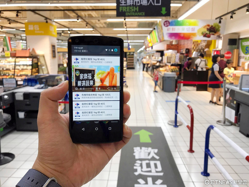 ▲家樂福現場提供免費 WiFi,而且透過室內 WiFi 定位的方式,來定期為民眾推播客製化的優惠內容,好比說走到乾貨區,就可以自動推播乾貨區的優惠。(圖/記者洪聖壹攝)
