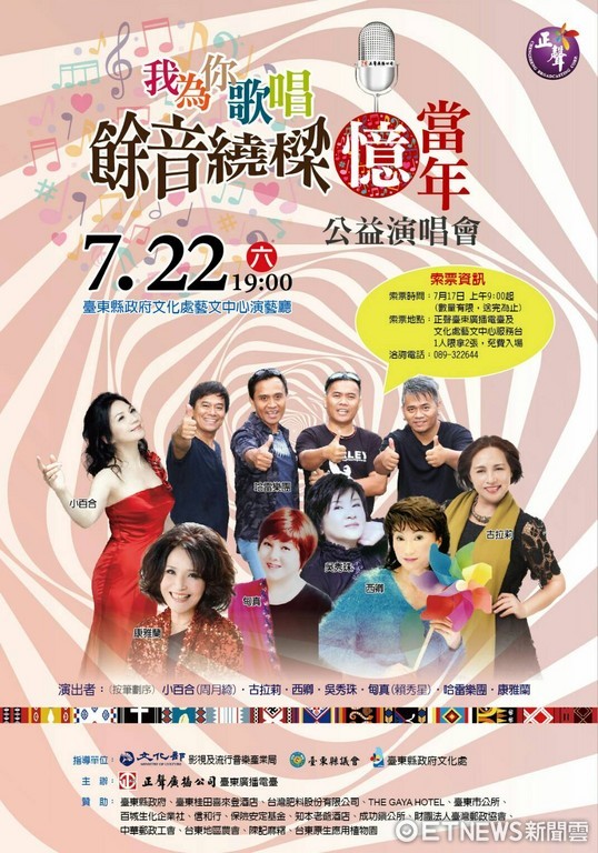 正聲電台台東台為感謝廣大聽友與地方各單位的支持,7/22在台東縣政府文化處藝文中心演藝廳舉辦『我為你歌唱~餘音繞樑憶當年』公益演唱會。