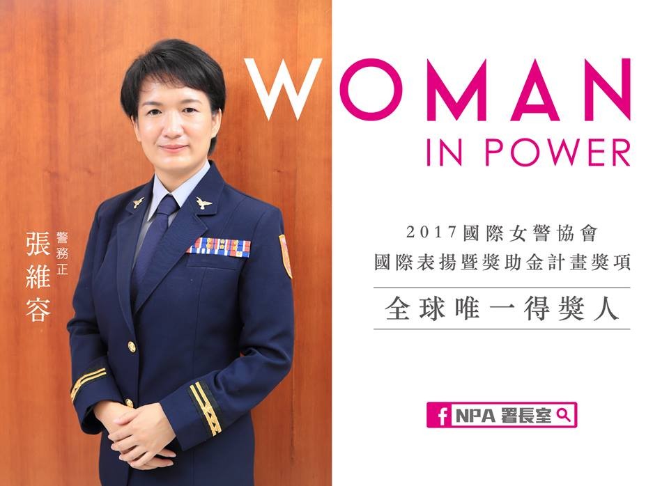 近年來女性投入警職不斷攀升,NPA署長室臉書19日晚間指出,來自台灣雲林農村女孩張維容獲2017國際女警協會「2017年全球女警代表」,在世界各地菁英女性執法人員中脫穎而出,成全球唯一得獎人。