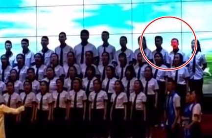 影片可以看見,當時學生們正在進行歌唱演出,所有人都全神貫注的在專心唱歌,前方指揮老師也相當用心,而後方投影銀幕也在不停變換畫面,最後一排卻有一名男學生看起來特別顯眼,因為燈光不但聚焦在他臉上,每一秒還不停變換顏色,畫面相當搞笑。