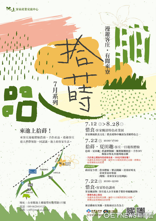 活動日期:7月22日(六)上午10:00~12:00 池上客家產業交流中心─地牛故事館資訊: 地址 台東縣池上鄉慶豐村慶豐路153號 電話 089-862041 分機135 官方網站https://www.vdyco.com/Default.aspx Facebook粉絲專頁https://www.facebook.com/chishanghakka/ 新聞/活動洽詢:池上客家產業交流中心工作小組089-237128 魏小姐