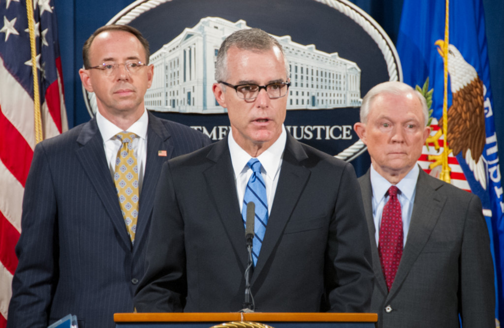 ▲聯邦調查局代理總監安德魯·麥卡貝(Peter McCabe,中間),副總檢察長傑夫·斯圖斯特(Jeff Sessions,右)和副總檢察長羅森斯坦(Rod Rosenstein,左)在20日華盛頓舉行的新聞發布會上宣布,將全球最大的黑市交易網站AlphaBay關閉。(圖/取自FBI/下同)