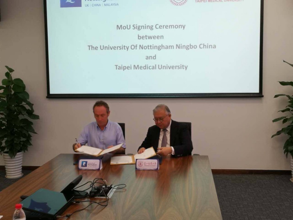 台北醫學大學21日與英國諾丁漢大學(The University of Nottingham)在諾丁漢大學寧波分校進行簽約。北醫大表示,希望雙方未來能夠擁有合作計畫讓彼此的學生和教授能互相交流,未來也會開設更有競爭力的課程,吸引更多國外的學子來北醫大學習。
