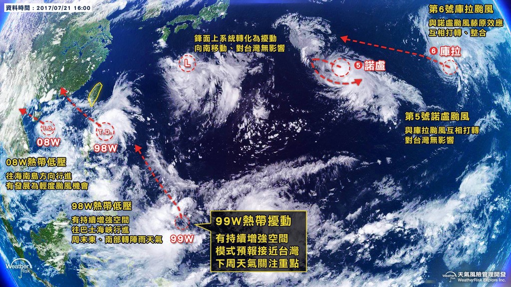 至於中太平洋的第5、6號輕度颱風諾盧及庫拉,未來可能產生藤原效應,再海面上互繞,雙颱因距離太遙遠,對台灣天氣都沒有直接影響。另外中西沙島海面也有一個熱帶性低氣壓,有發展為輕度颱風的趨勢,正以時速20公里向西北西移動。