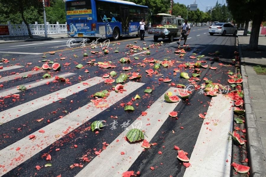 湖北省十堰市張灣區一輛轎車因為車速過快,撞上一輛載有600公斤西瓜的小貨車,結果西瓜就大量散落在事發路段上,約有20公尺都被西瓜「染紅」,不過更為奇景的是,許多路人見狀都來撿西瓜吃,引發網友討論。