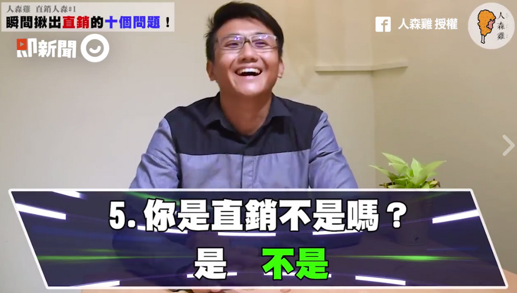 原來是文字大考驗啊!粉專「人森雞」在臉書上傳一則影片,內容教大家辨識「對方是否是直銷」,用文字遊戲的方式逼問,最後讓對方反應不過來而直接承認,讓看完影片的網友直呼「套路都一樣啦!」