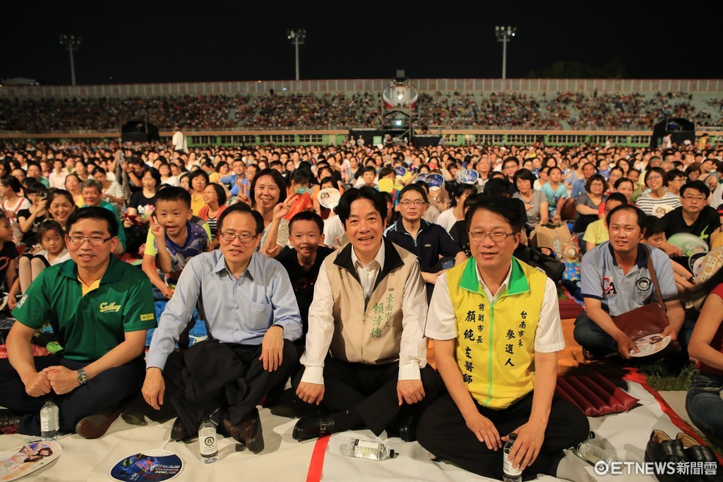▲台南市長賴清德與萬名觀眾席地而坐凝神觀賞演出,陶醉在舞者絢爛動人的舞姿中。(圖/市府提供)