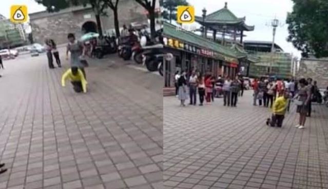 事件發生於7月16日,一開始只看得出是男女朋友在街上爭吵,但後來從影片中可以觀察到,男友努力想安撫女友激動的情緒,還直接直接跪在地上。不過男友的舉動似乎沒甚麼用,女友仍持續撕開喉嚨大吼大叫,後來甚至把男友的帽子丟出去,要男友跪著爬去撿,「你不要求我,你給我往前走!」、「你敢起來,你試試看!」