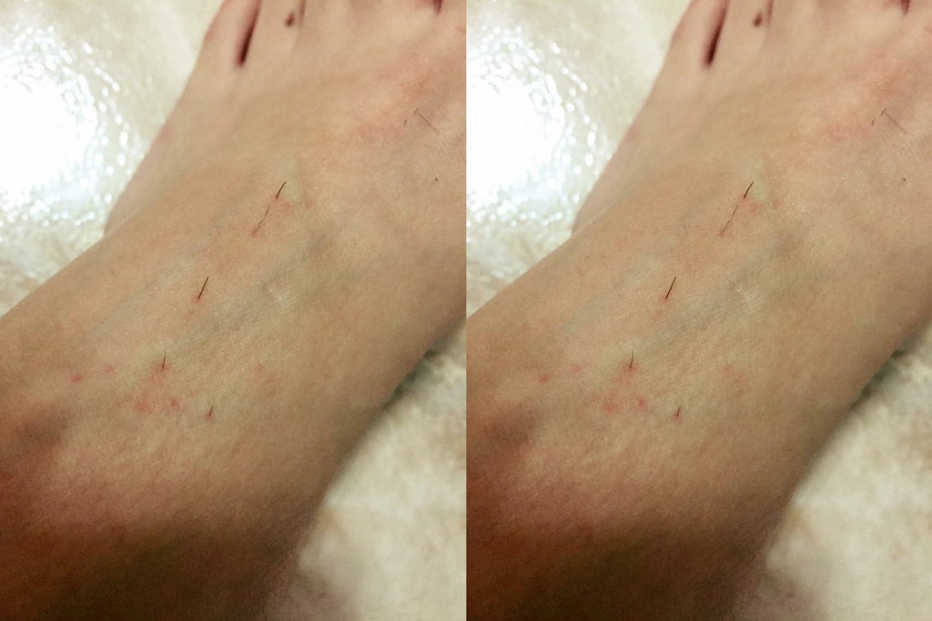 ▲原PO的左腳腳背被插至少5根細小頭髮。(圖/翻攝「爆料公社」)