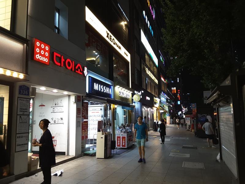 走在街上,ETUDE HOUSE(化妝品店)、TONYMOLY(化妝品店)、INNISFREE(化妝品店)、OLIVE YOUNG(美妝店)、新韓銀行、國民銀行、大創(五金行)、PARIS BAGUETTE(麵包店)、星巴克、販賣台灣珍奶的貢茶、CU(便利商店),一家家商店映入眼簾。