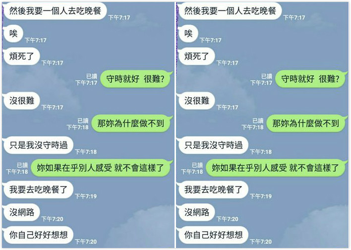原po越想越氣,傳訊息質問女生,「守時就好,很難?」沒想到對方竟回,「沒很難,只是我沒守時過」,後來甚至反過來腦羞,叫他乾脆去找別的女生。