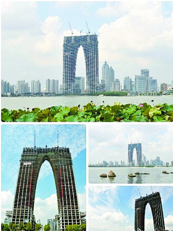 蘇州金雞湖畔的「東方之門」被公佈即將完工的照片,由於建築的設計太像一條褲子,因此遭網友吐槽大樓整體像「衛生褲」與「低腰牛仔褲」,還有人感嘆,央視大樓「大褲衩」終於不再孤獨。