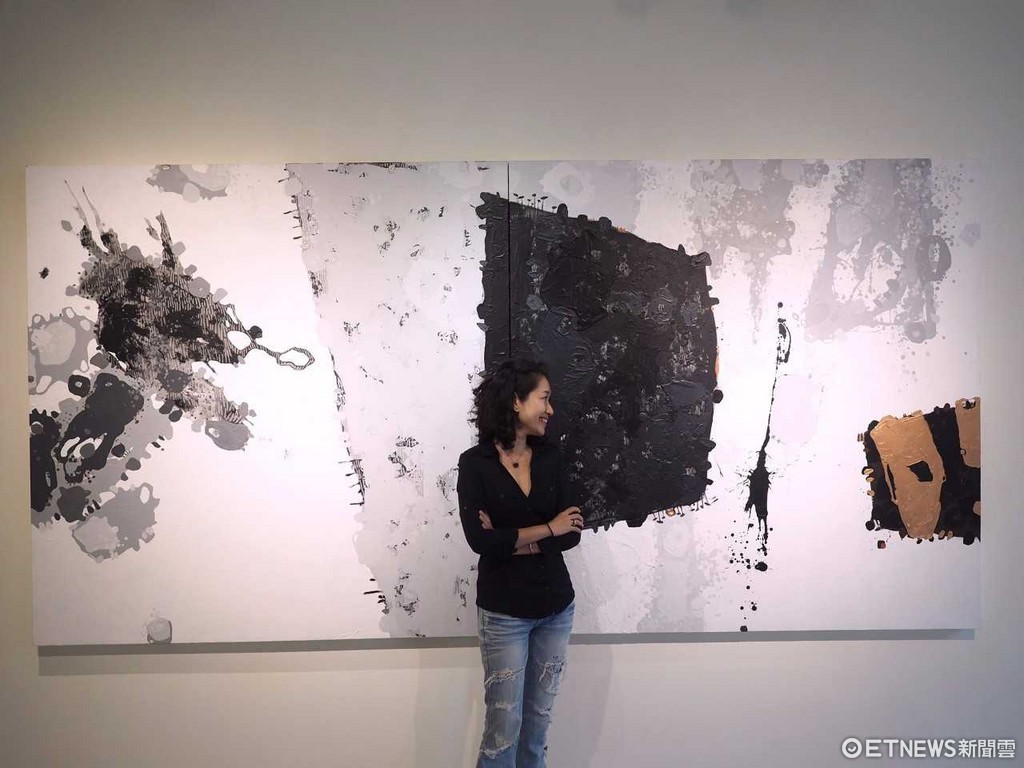 現代人生活空間不足,色彩繽紛雖然漂亮但也讓人覺得「很擠」。藝術家龎銚就以黑白灰與金屬色為主的畫作,調配出畫面的空間結構和平衡、讓繪畫最純粹的本質精神能呈現出來。她說,「美」不只存在於藝術品中,更是存在於我們的生活當中,「空間就是一張最好的畫布」。