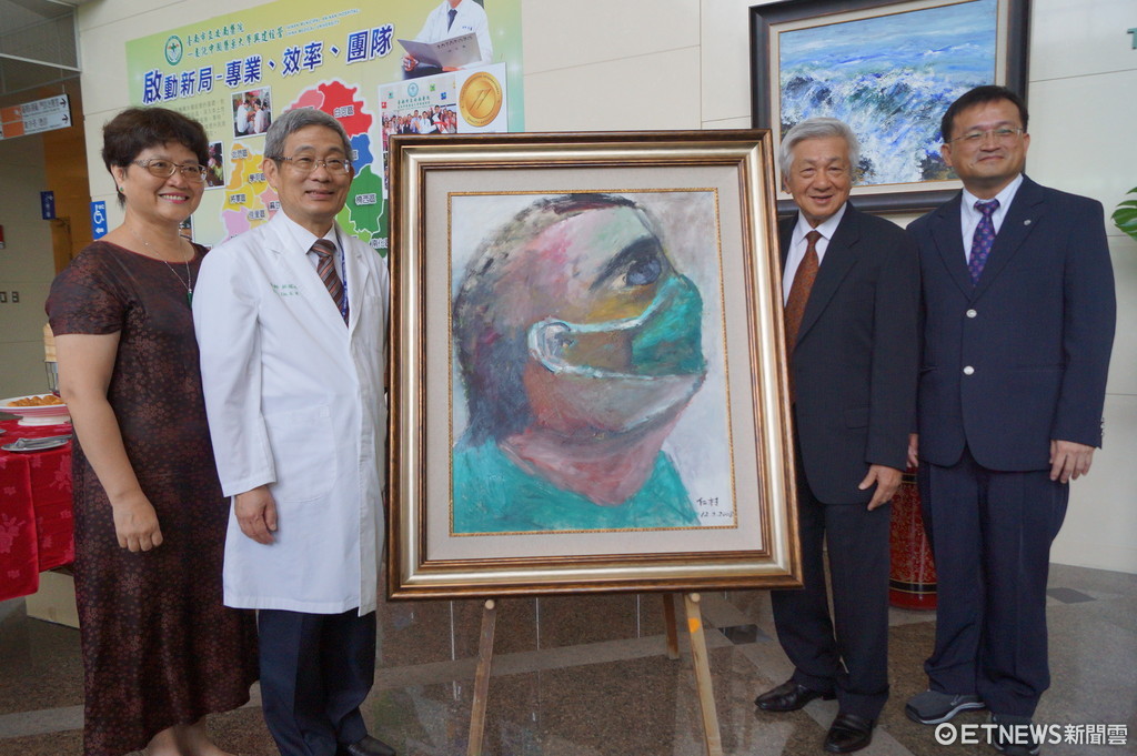 ▲黃仁村院長(右二)特地展示其最得意作品,並與台南市衛生局長陳怡(右一)及林瑞模院長賢伉儷(左一、二)合影留念。(圖/安南醫院提供)