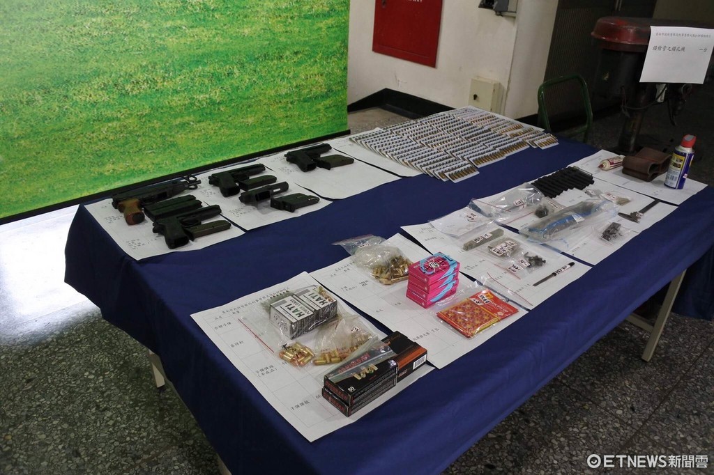 ▲警方起獲改造俄製天蠍衝鋒槍、手槍、各式子彈、改造工具等大批證物。(圖/記者林悅翻攝)