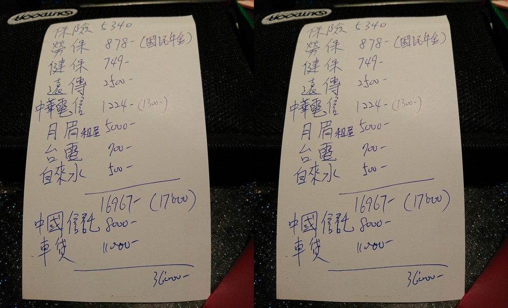 他表示,花了一些時間仔細計算了每月開銷,發現根本沒故意亂花錢,但收入就是不夠用。根據他列出的支出明細來看,每月花費有,保險費5340元、勞保878元、健保747元、遠傳2500元、中華1224元、月眉租屋5000元、台電700元、自來水500元、中國信託8000元、車貸11000,合計就快逼近36000,這還不包含吃飯、生活等花費,難怪月薪4.5萬元還是不夠用!