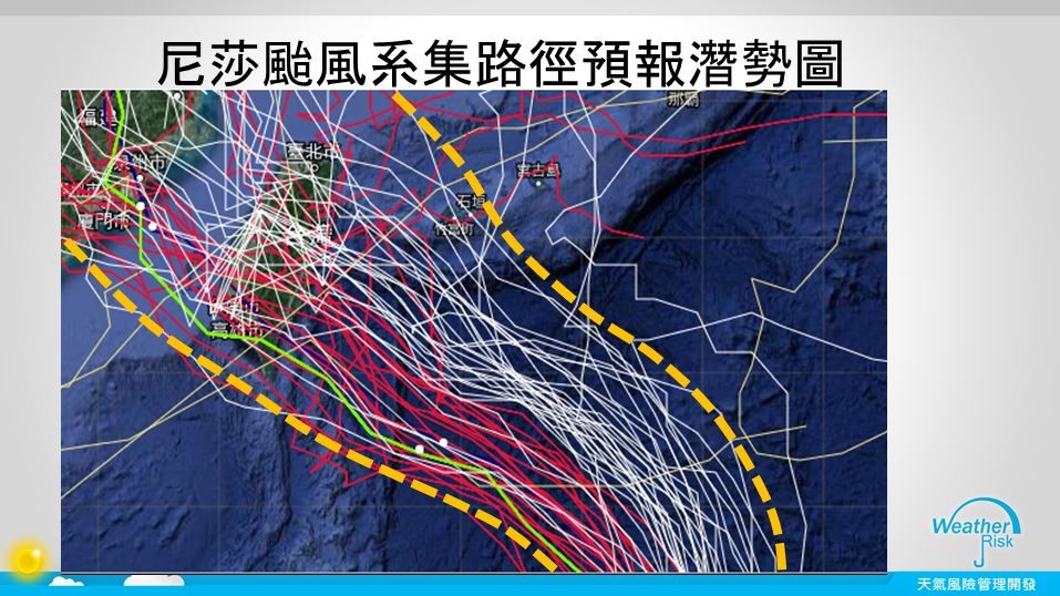 而根據路徑潛勢預報資料顯示,尼莎颱風直撲台灣而來,且有可能從東部登陸並穿過台灣到巴士海峽,變成所謂的「穿心颱」。至於日本氣象廳及美軍聯合颱風警報中心的預測資料也強調,尼莎颱風的暴風圈將會「包住台灣」,請民眾做好防颱準備。