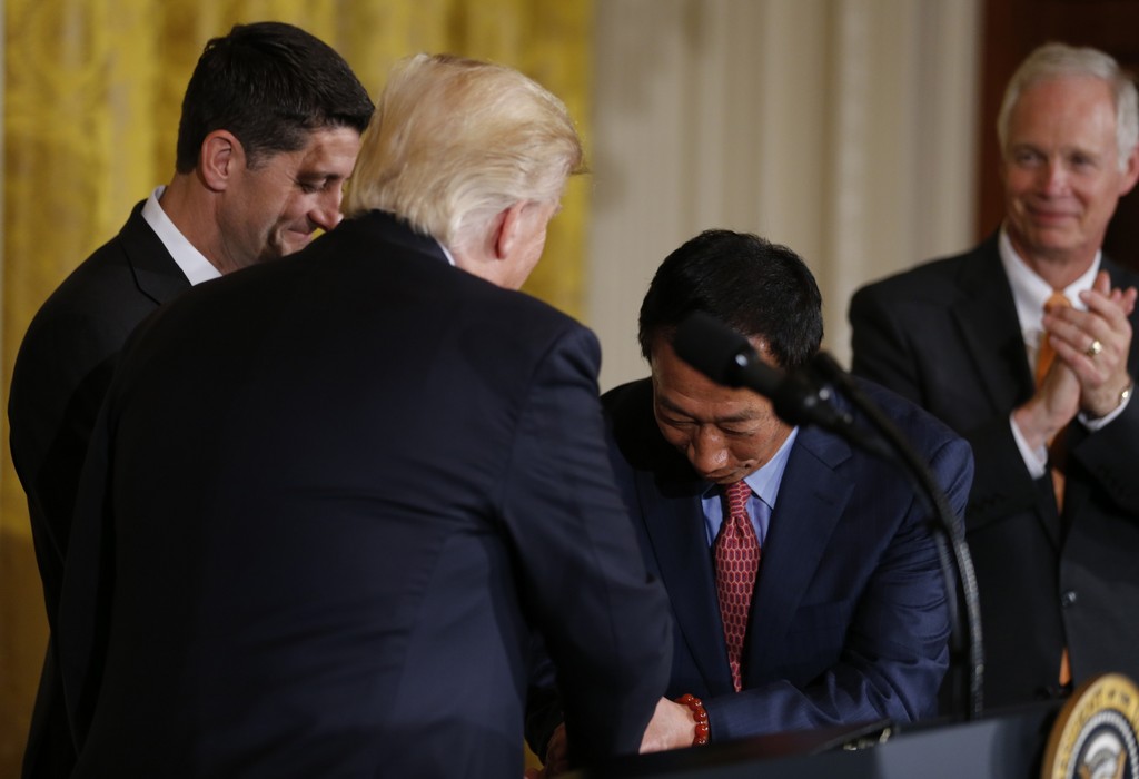 川普隨後上台和郭台銘握手,並致詞表示,「這對美國工人和製造業者,以及相信『美國製造』這個概念及品牌的人,是美好的一天。」他說郭台銘是朋友,「如果我沒有當選,他(郭台銘)絕對不會花費100億美元」。