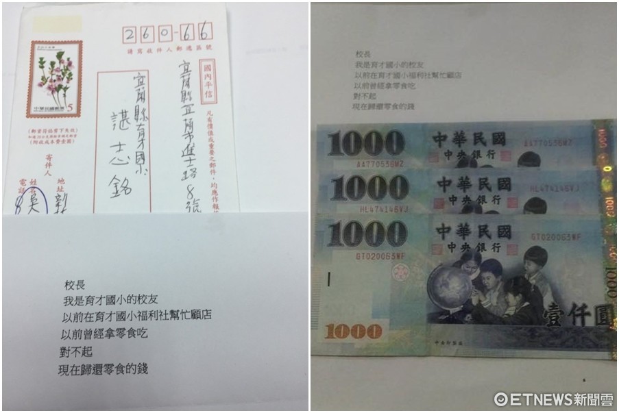 諶志銘表示,該封信上寫著:「校長,我是育才國小的校友,以前在育才國小福利社幫忙顧店,曾經拿零食吃,對不起,現在歸還零食的錢。」信內更附上3張千元鈔票。
