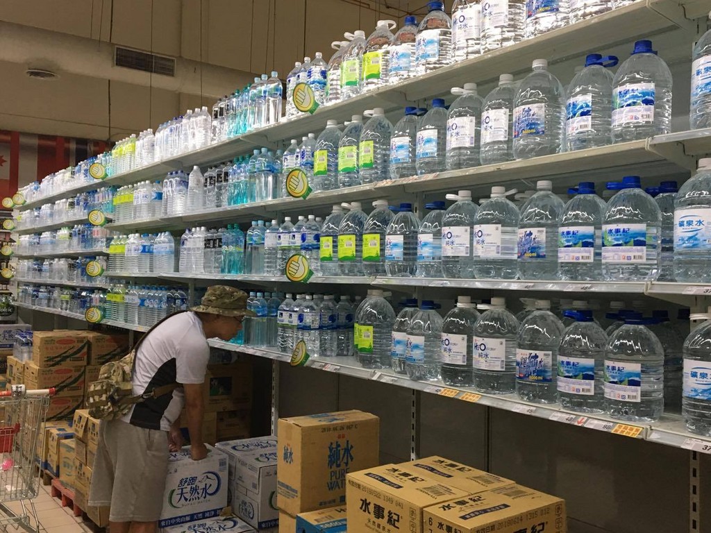 愛買表示,過去颱風前夕礦泉水的銷量都會飆漲5倍以上,因此目前已緊急設立「颱風專區」,並已備妥2倍以上庫存量因應,共有上千款礦泉水、泡麵、熟食、微波即食品、雨具用品等防颱商品買一送一起。